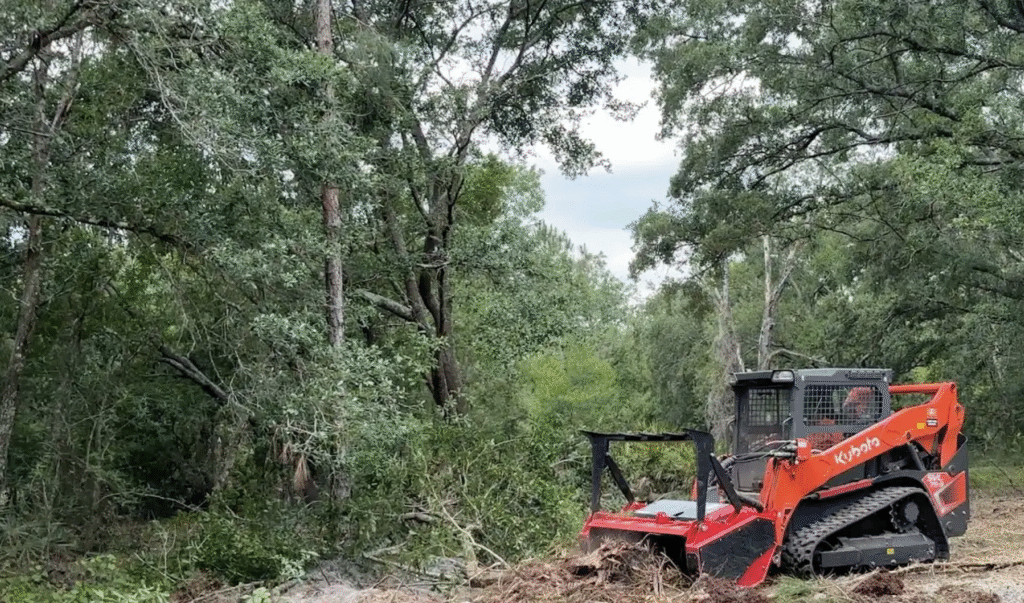 Forestry mulching is a land-clearing method that uses a single machine to cut, grind, and shred brush, small trees, and vegetation into natural mulch — right where it stands. This process leaves behind a clean layer of mulch that helps control erosion, retain soil moisture, and prevent regrowth.